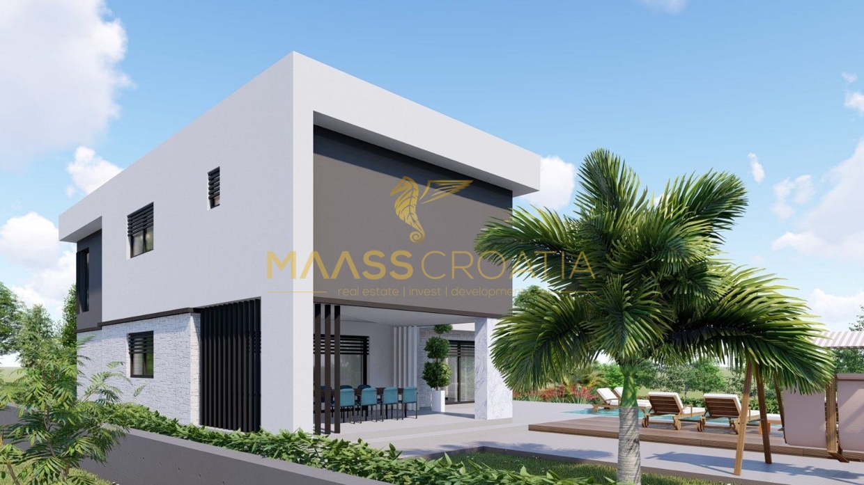 Te koop is een bouwkavel van 260 m² met een project voor een luxe villa in aanbouw, gelegen in Marčana, in een rustige wijk omgeven door olijfbomen en open landbouwgrond. De villa heeft een modern ontwerp, een overloopzwembad, grote terrassen en een panoramisch uitzicht op Učka, Velebit en Cres.