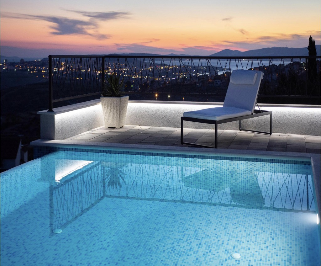 Een prachtig, ruim zwembad op het terras springt in het oog, omdat het een perfecte positie heeft om de fantastische zonsondergangen over de baai te bekijken en je het gevoel te geven dat je in je eigen exotische oase bent!
