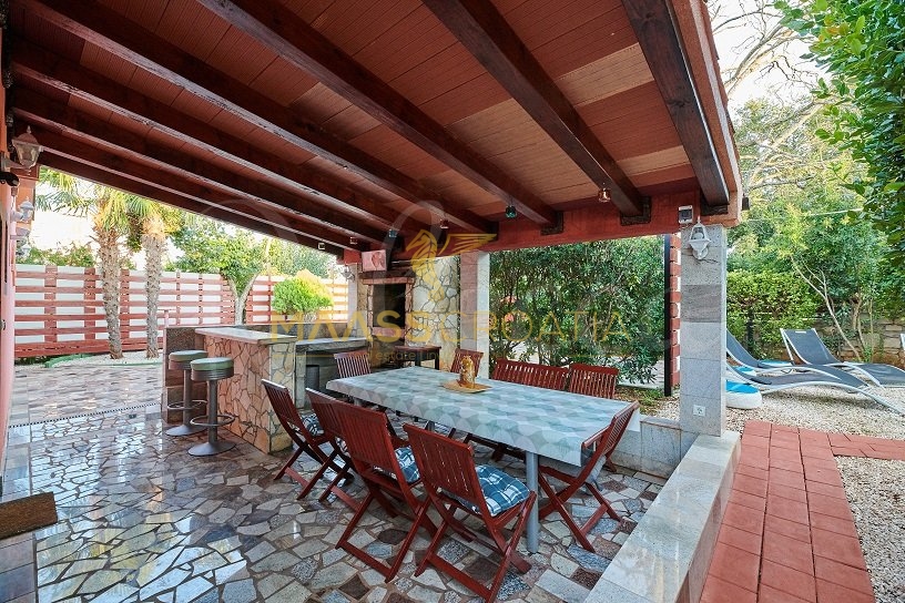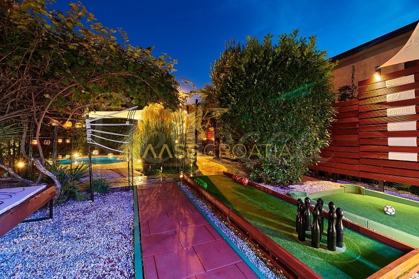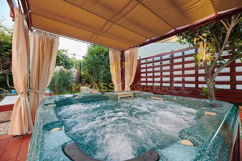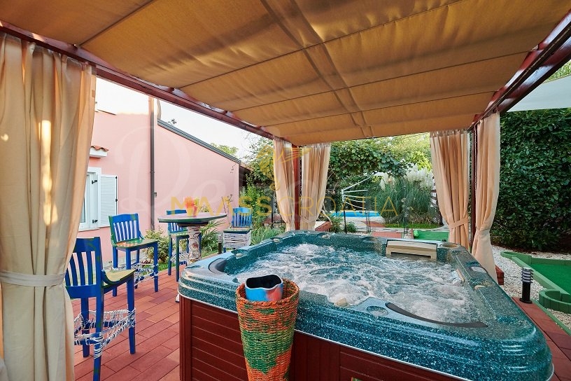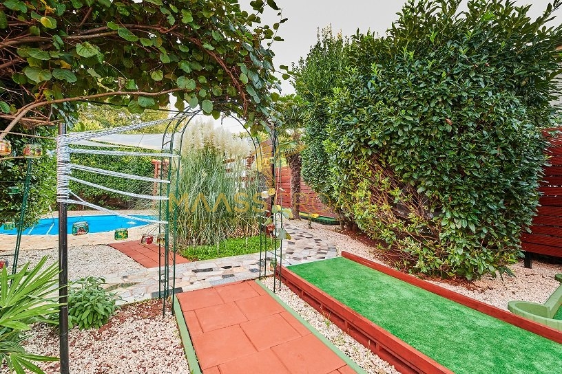 De villa wordt omringd door een perceel van ongeveer 700 m² waarin zich een zwembad bevindt, een apart overdekte en verlichte jacuzzi en extra faciliteiten voor rust en ontspanning zoals minigolf en een voetenbad, allemaal omringd door prachtige mediterrane planten (olijven, vijgen, laurierkers, laurier, etc.).