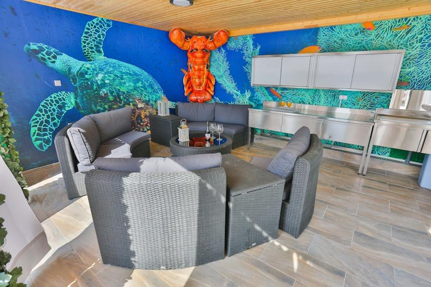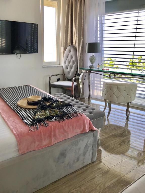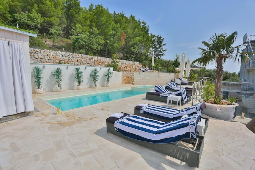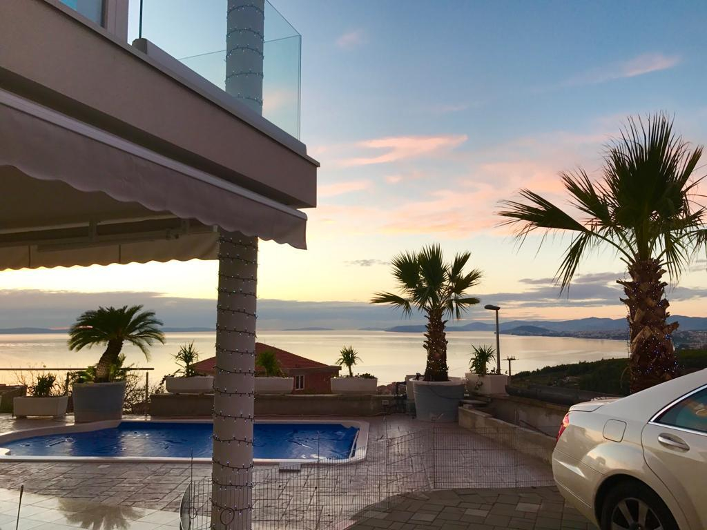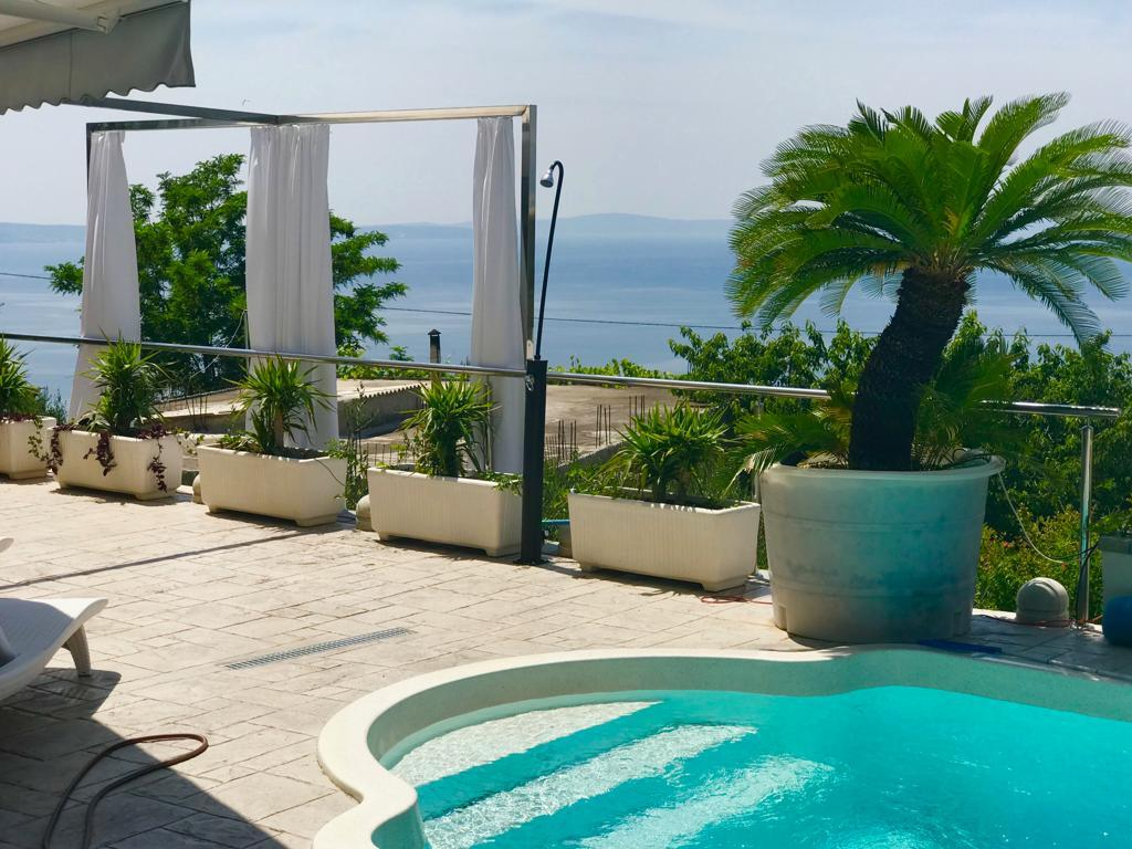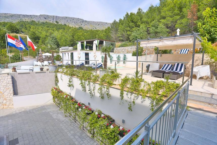 Op het bovenste terras is er een jacuzzi met sauna in een pergola-vormige loungehoek, vanwaar je een prachtig uitzicht hebt op het centrum van Split en het platteland op de achtergrond. De inrichting is luxueus, met marmer en hoogwaardige materialen. Het huis is echt zo luxueus mogelijk ingericht, zelfs in de inrichting hebben we een aantal hoogwaardige materialen en apparaten verwerkt. Het ruime interieur is een goede mix van eclectische en moderne stijl, wat de villa echt beschrijft als een verfijnd huis met een lichte sfeer. Het huis heeft twee grote balkons die je vanuit beide slaapkamers kunt bereiken en vanwaar je kunt genieten van adembenemende zonsondergangen over de baai en de nabijgelegen eilanden. Op de oprit zijn 5 grote parkeerplaatsen voor je auto’s. Er is een klein deel van de tuin dat voornamelijk wordt gebruikt voor esthetische doeleinden, maar ook een klein deel met lokale vegetatie dat vrolijke kleuren toevoegt aan de overwegend wit/blauwe esthetiek. Al met al is deze plek ideaal voor wie op zoek is naar een plek met veel ruimte voor entertainment. Dit is ook een ideaal huis voor iedereen die op zoek is naar een spannende vakantie weg van huis.