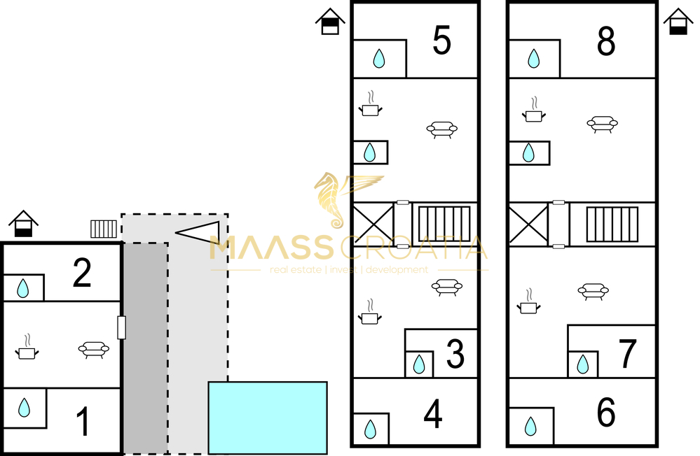 Het huis bestaat uit vijf volledig ingerichte wooneenheden voorzien van alle extra’s.
