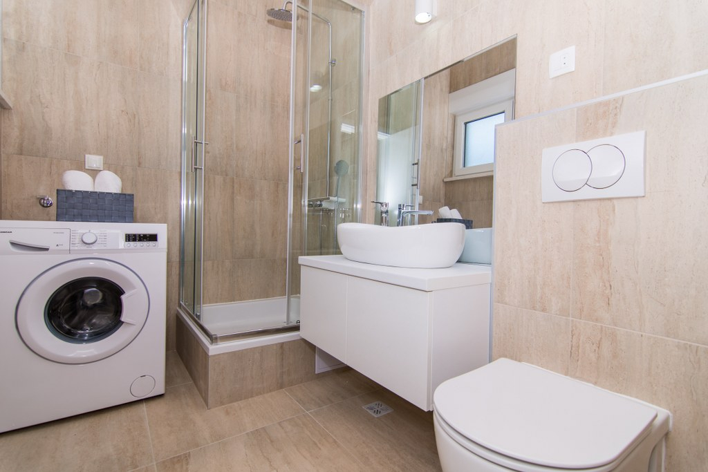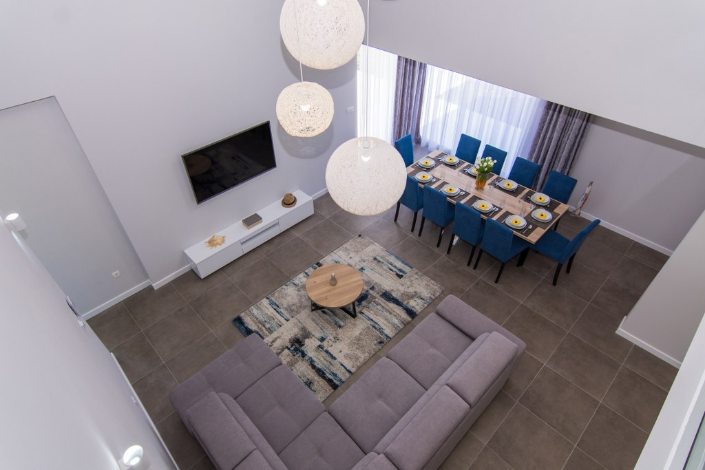 Het ruime zwembad op het terras op de begane grond is waarschijnlijk het hoogtepunt en vormt de ideale plek om te socializen met vrienden en familie. Naast een prachtig ontworpen terras dat binnen en buiten harmonieus combineert, biedt deze eethoek de perfecte mix van ontspanning, panoramisch uitzicht, culinaire hoogstandjes en gezellige uurtjes met familie en vrienden. Achter in de tuin, genesteld in een klein tuinhoekje, nodigt een stenen barbecue je uit om te blijven hangen. Het minimalistische tuinontwerp biedt weinig ruimte voor planten en dieren, maar plaatst desondanks kleurrijke accenten in de verder eenvoudige en elegante inrichting. Het strand en het stadscentrum liggen op loopafstand, zodat je de historische oude stad Kašteli in slechts een paar minuten kunt bereiken. Dit huis betovert je met zijn droomachtige ligging. Frisse lucht, helder water en het kleurrijke landschap creëren een harmonieuze en ontspannen sfeer.