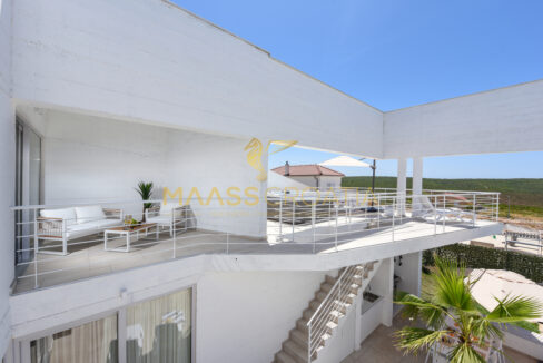 Op de foto’s zie je ook de trap naar de bovenverdieping, waar nog drie slaapkamers met eigen badkamer en balkon zijn.