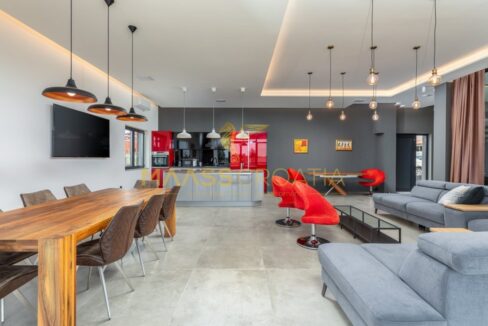 De begane grond van deze nieuw gebouwde en moderne villa heeft een plafondhoogte van 3,10 m, terwijl de eerste verdieping een hoogte heeft van maar liefst 2,8 meter. In combinatie met betonlook muren en grote raampartijen, precies wat liefhebbers van de moderne, ietwat koele clean-look stijl zoekt.