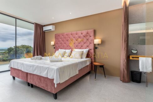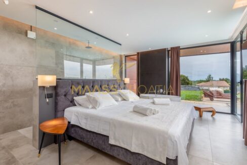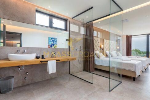 Er zijn 4 slaapkamers met en-suite badkamers en de grote woonkamer met keuken en eethoek. Dit gloednieuwe vakantiehuis is een echte architectonische attractie en een van de mooiste huizen in Istrië.