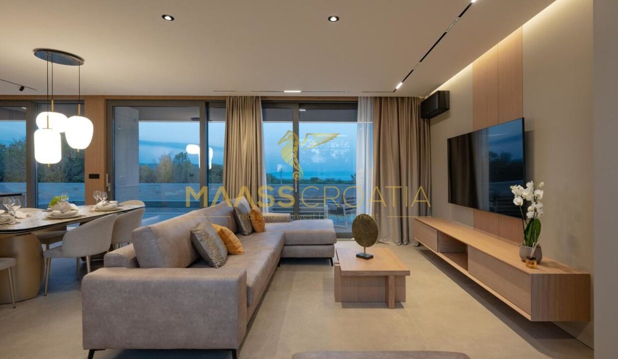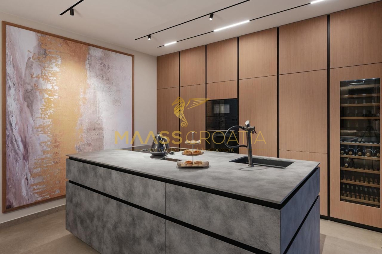 Het interieur heeft drie slaapkamers, elk met een eigen badkamer, evenals een ruime woonkamer, eethoek en volledig uitgeruste keuken, ideaal voor gezinnen en het ontvangen van gasten. Op de begane grond is er een taverna voor gezelligheid en entertainment, terwijl het dakterras panoramisch uitzicht op zee biedt.