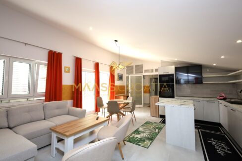 Een interne trap leidt naar de eerste verdieping, waar zich een tweede appartement bevindt met een totale bruikbare oppervlakte van 96,76 m², bestaande uit een interne trap, een hal, twee slaapkamers, twee badkamers, een keuken met eetkamer en een gezellige woonkamer met toegang tot een groot, onoverdekt terras.