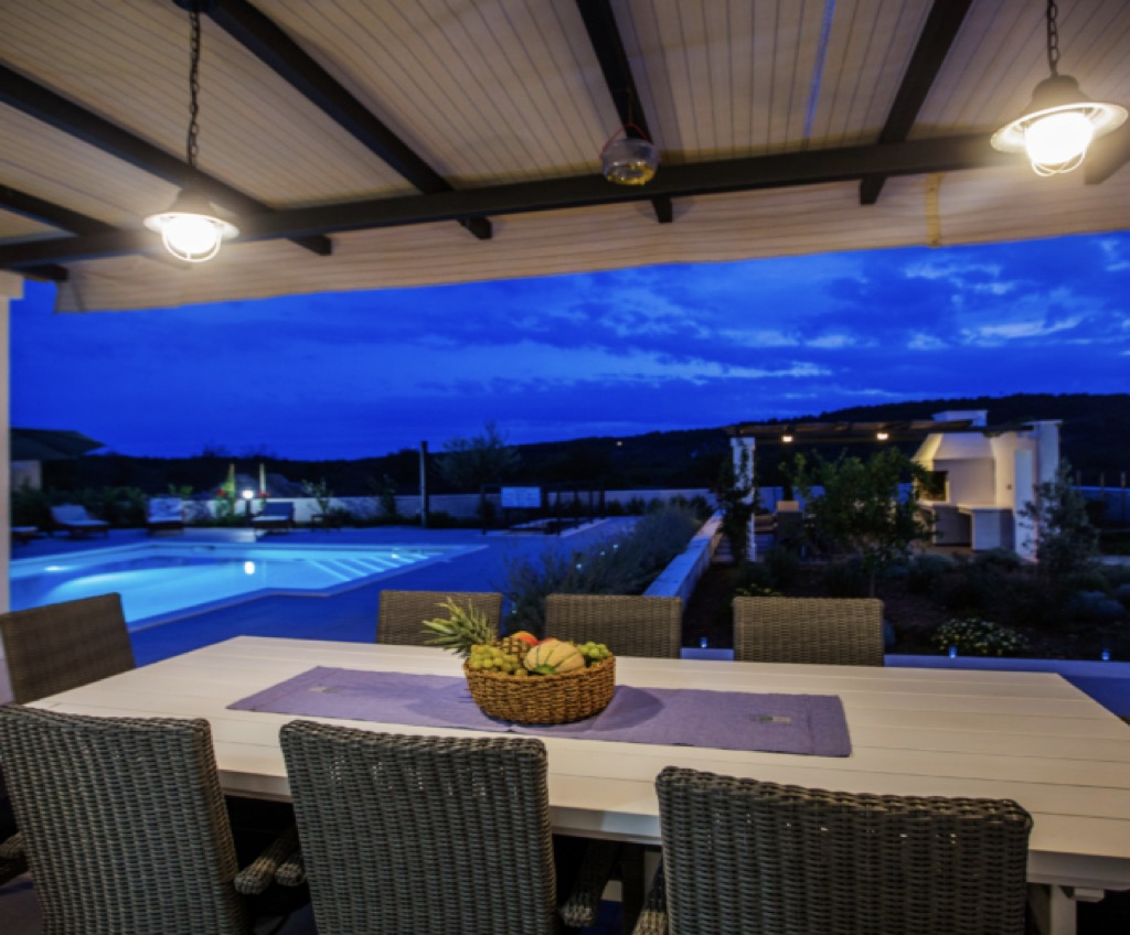 Iets verder weg van het hoofdterras op de begane grond, dat verbonden is met het huis, is er nog een loungeruimte met een buitenkeuken, ook overdekt met een functionele en mooie pergola.