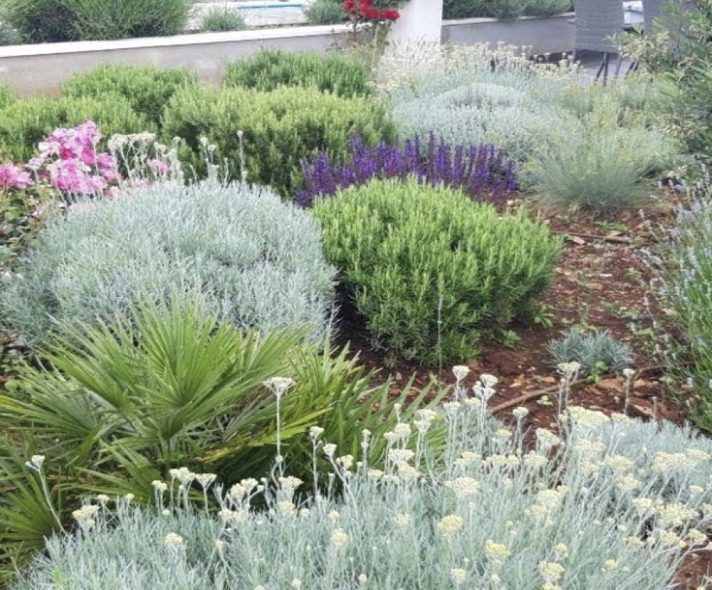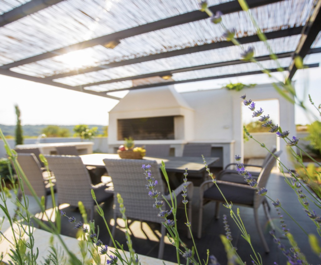 Het is strategisch gescheiden van het zwembad en de rest van de buitenruimte met een klein gedeelte van plantenmateriaal om privacy te bieden en een andere zone te creëren voor entertainment dan het hoofdterras.