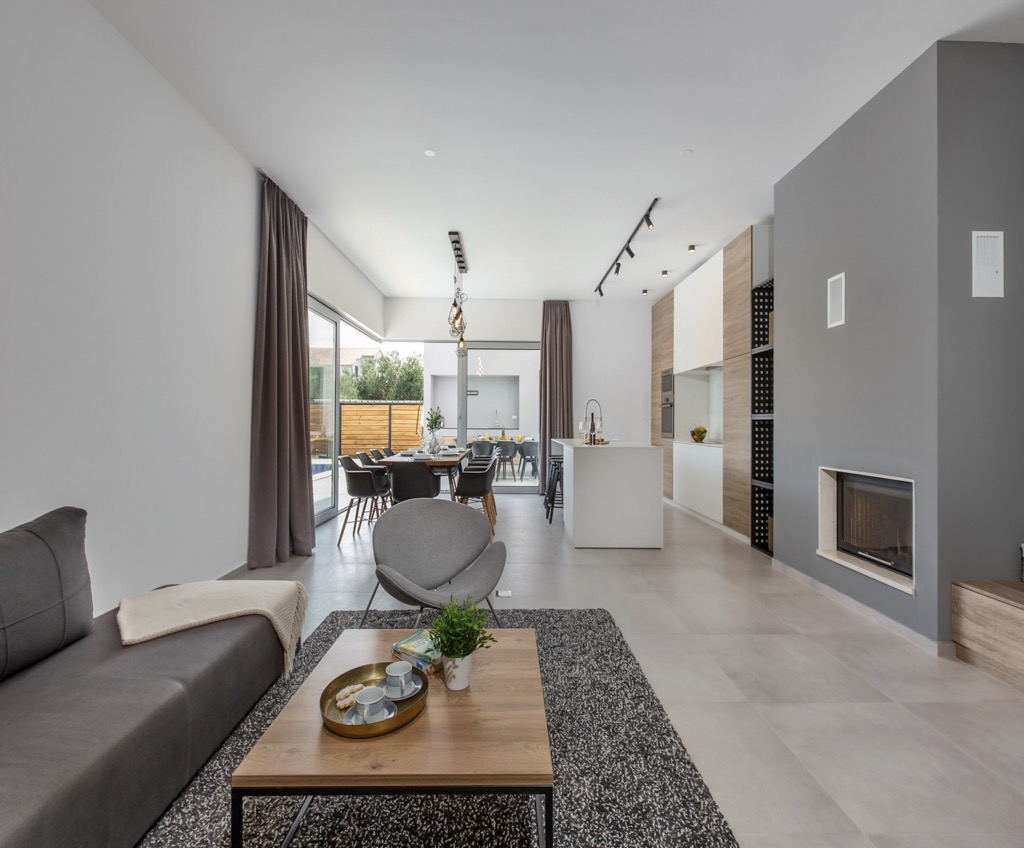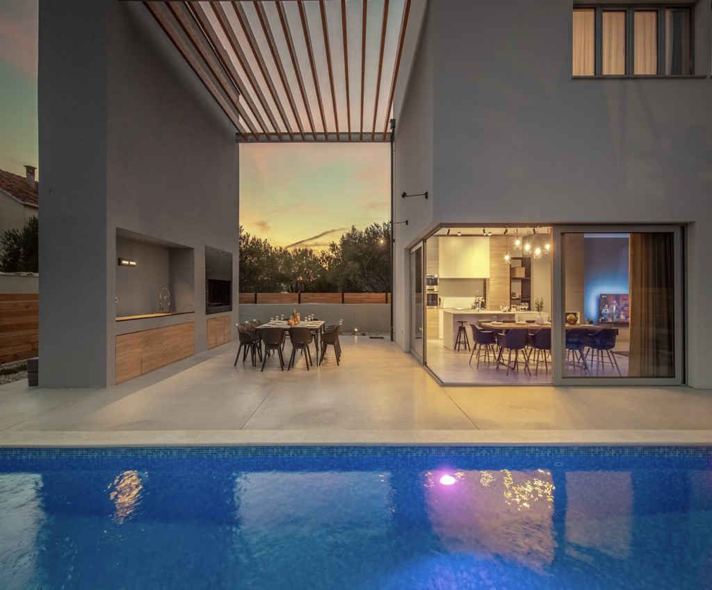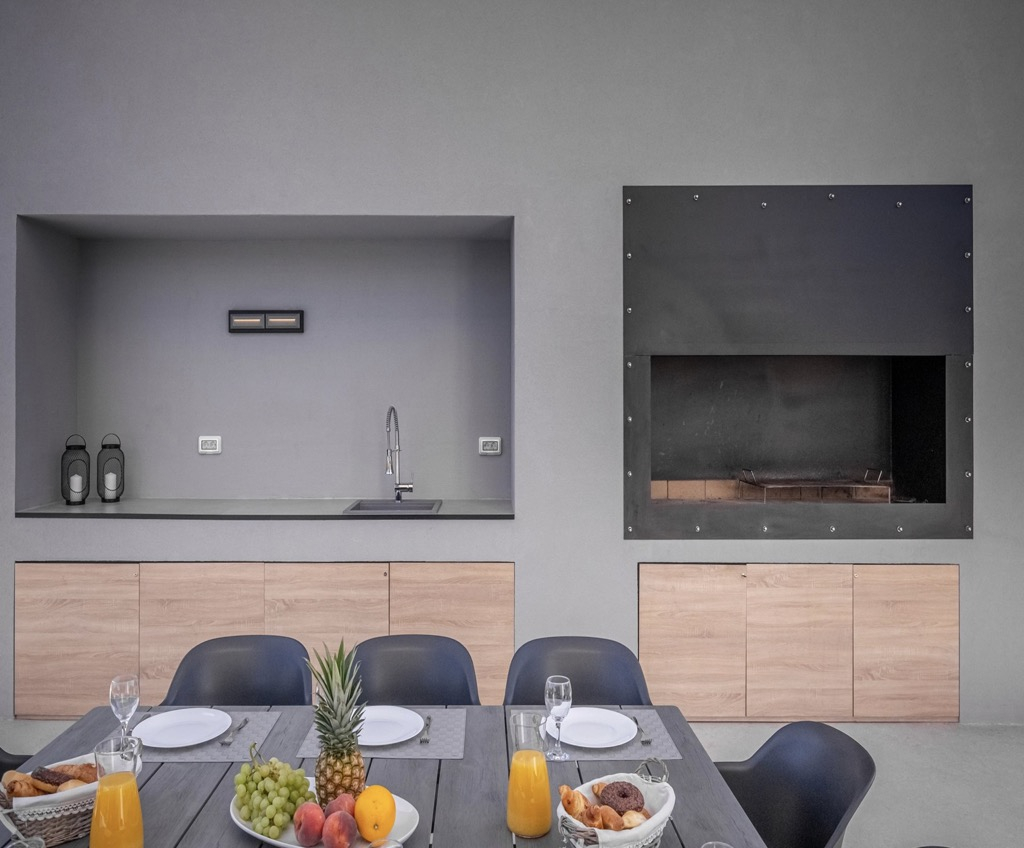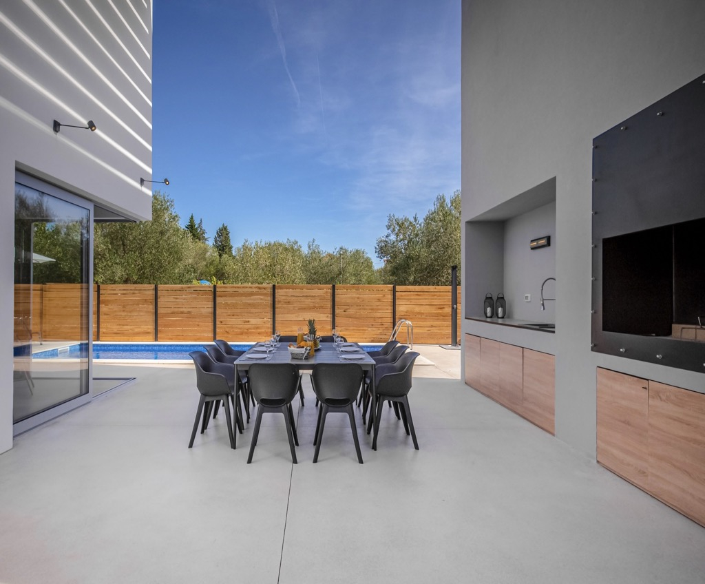 Buiten hebben we een ruim terras met een zithoek en een ultramoderne buitenkeuken, gevolgd door een groot zwembad dat de hele sfeer benadrukt en het nog luxueuzer maakt.