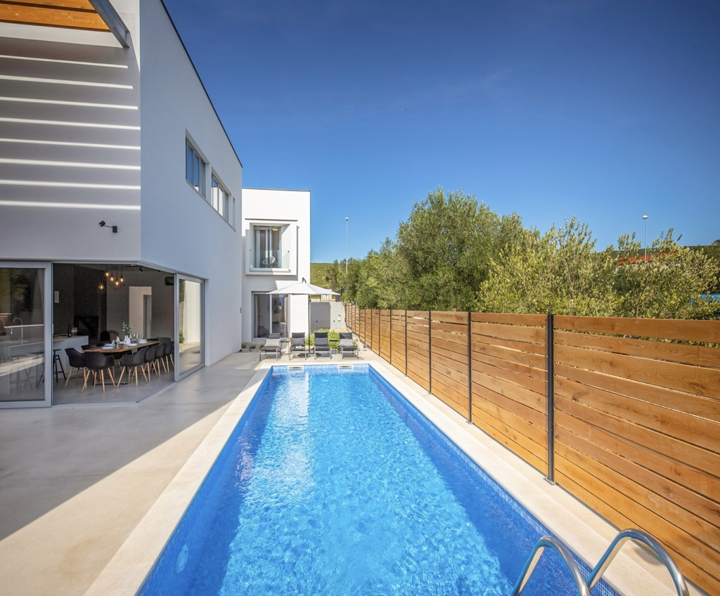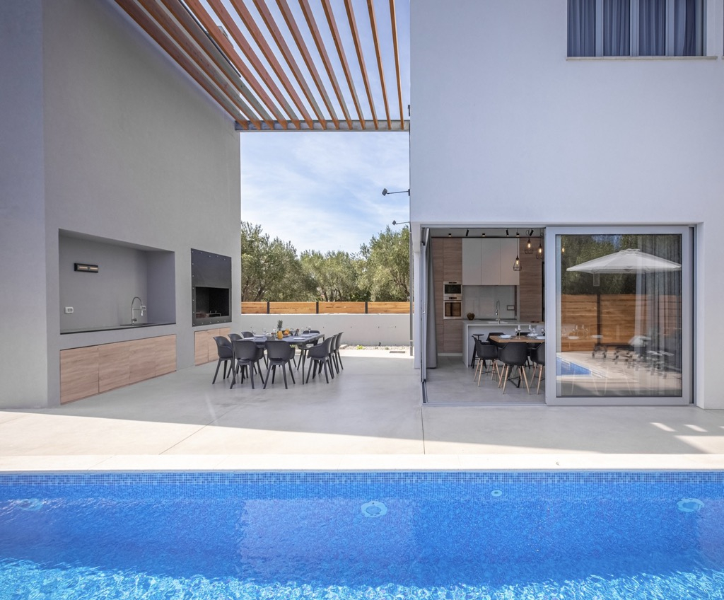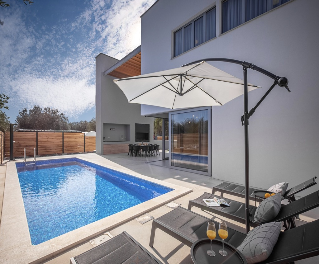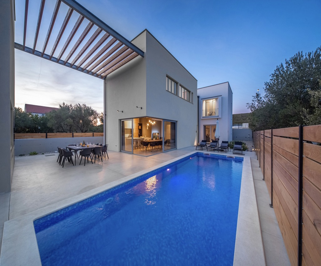 Neem even de tijd om deze prachtige, ultramoderne en innovatieve villa te bekijken, gelegen op slechts 20 km van het centrum van Zadar en op ongeveer 100 m van de zee.