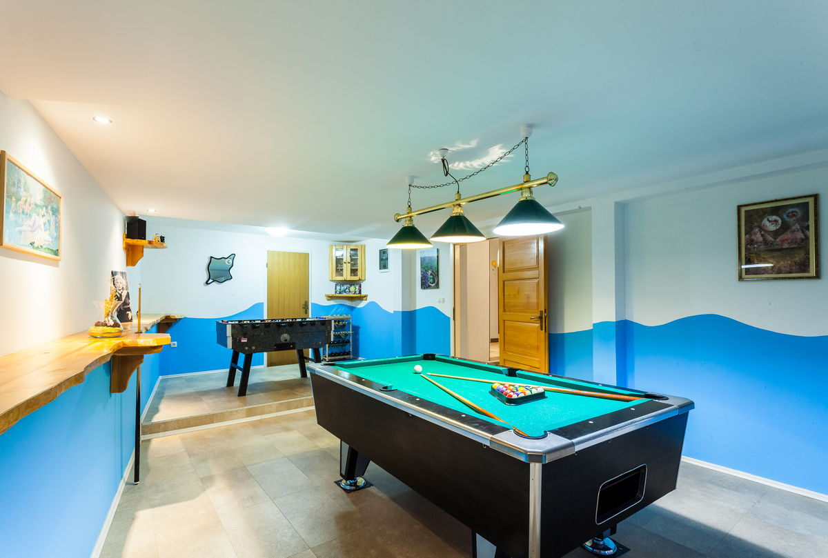 De ruime woonkamer en het hele interieur van het huis is zeer modern en stijlvol, volledig uitgerust met strakke en moderne apparatuur. Een extra bonus van dit huis is een extra speelkamer met een pooltafel, zodat je altijd genoeg ruimte hebt voor entertainment.