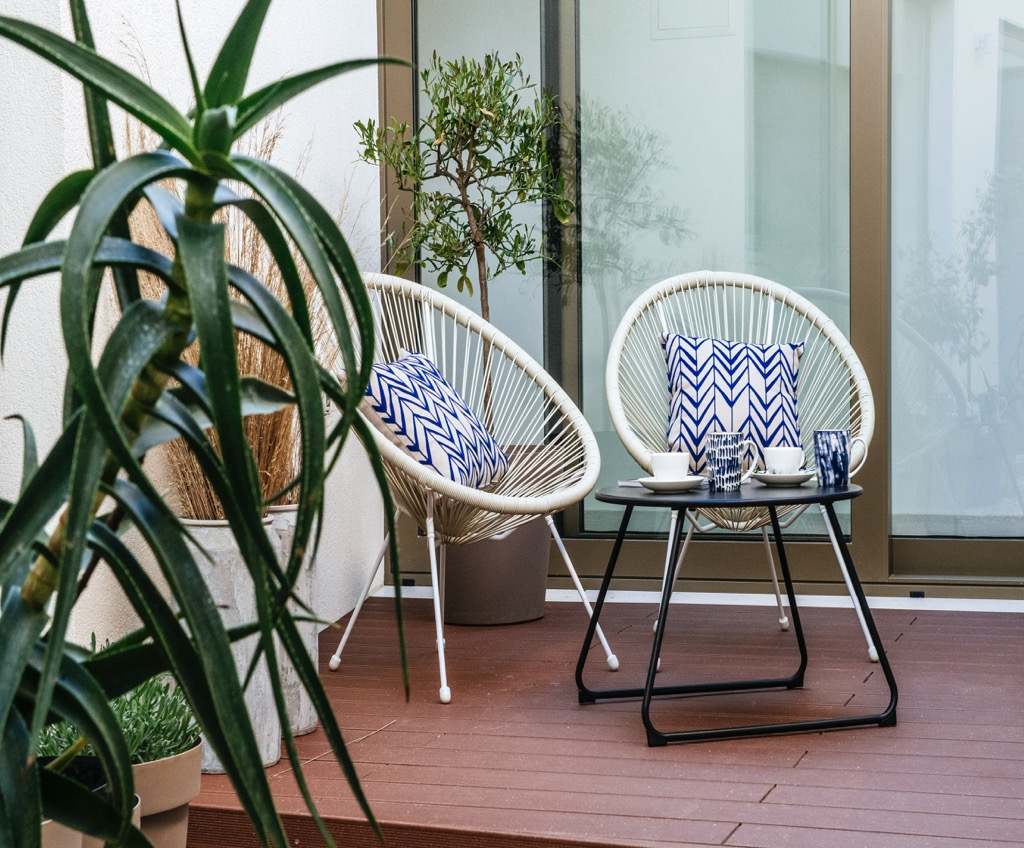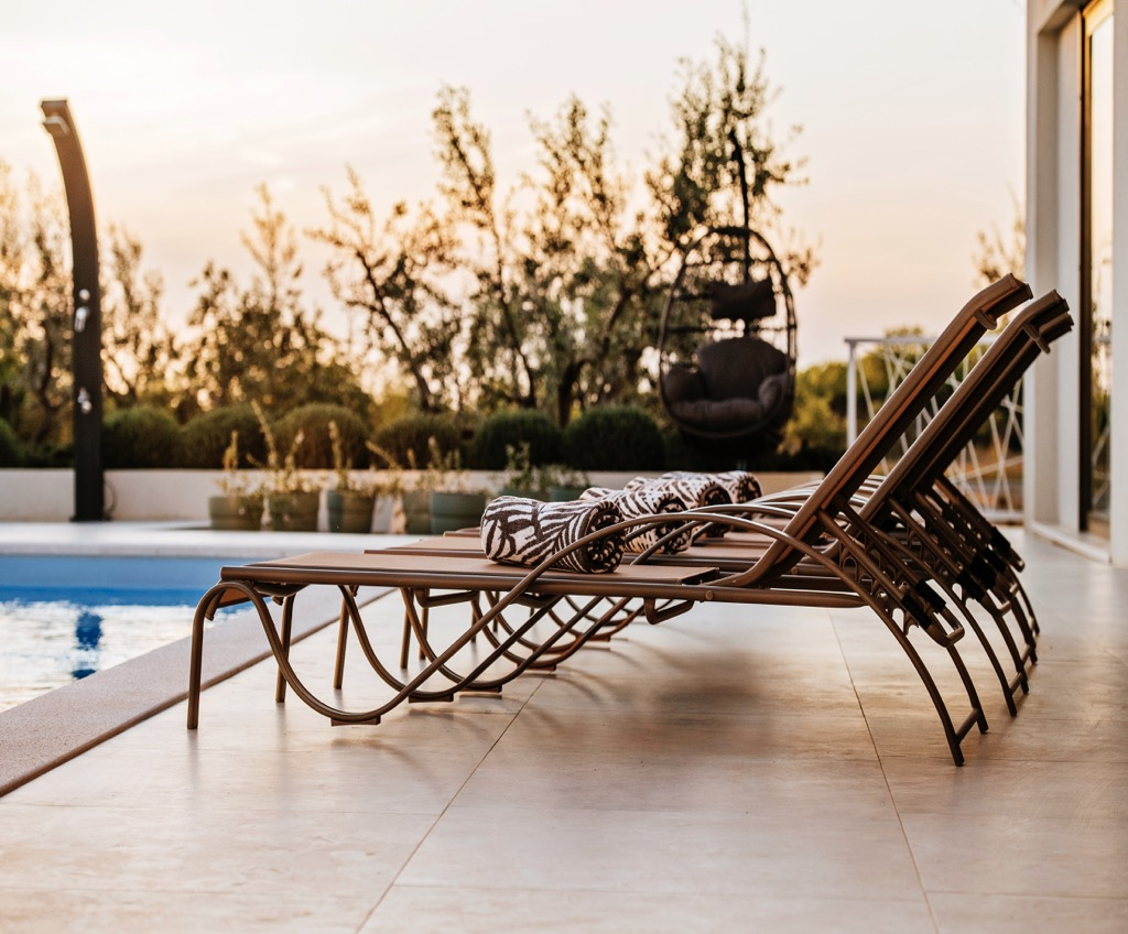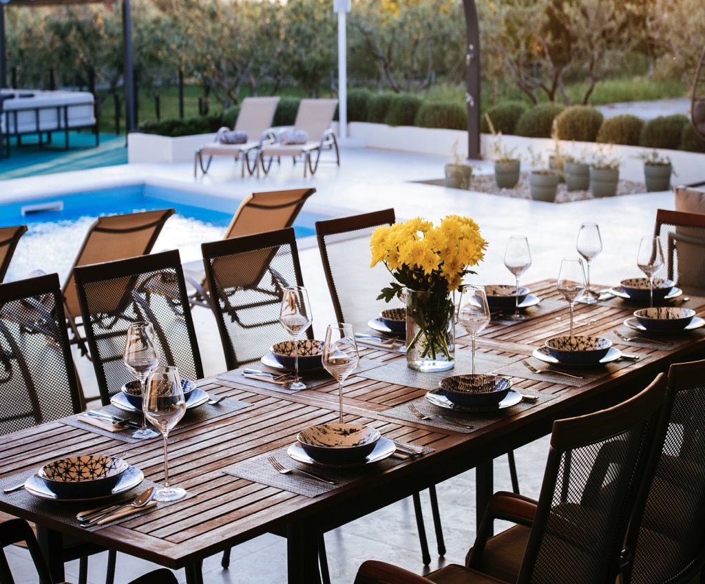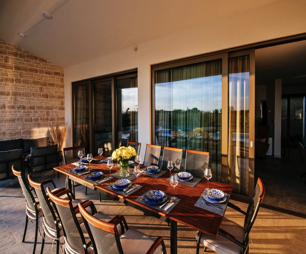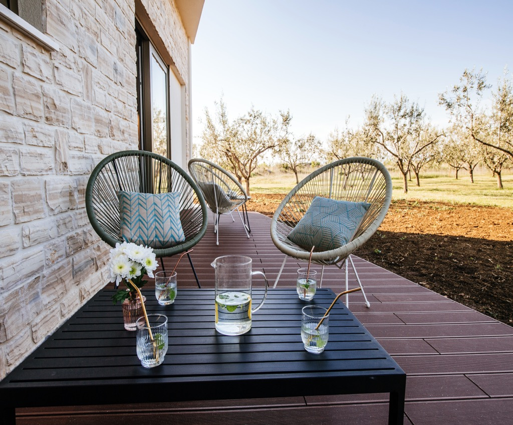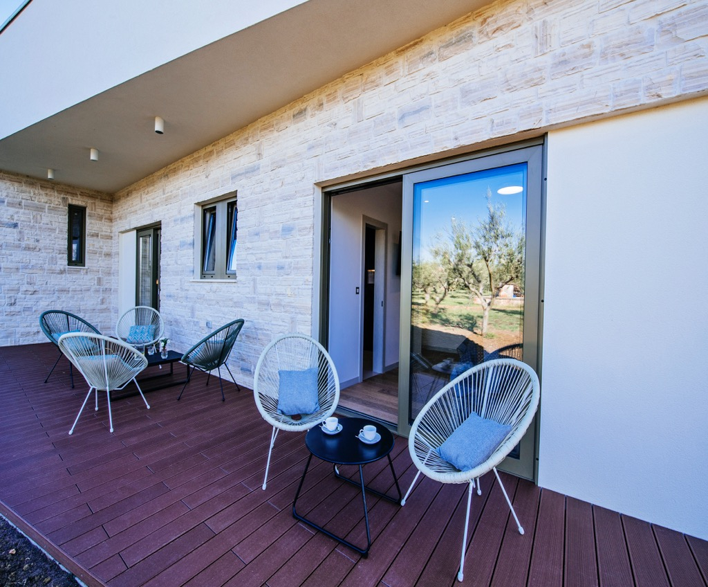 Het ruime terras, dat dienst doet als loungeruimte, is verbonden met een apart gastenverblijf en past harmonieus in het totaalconcept.