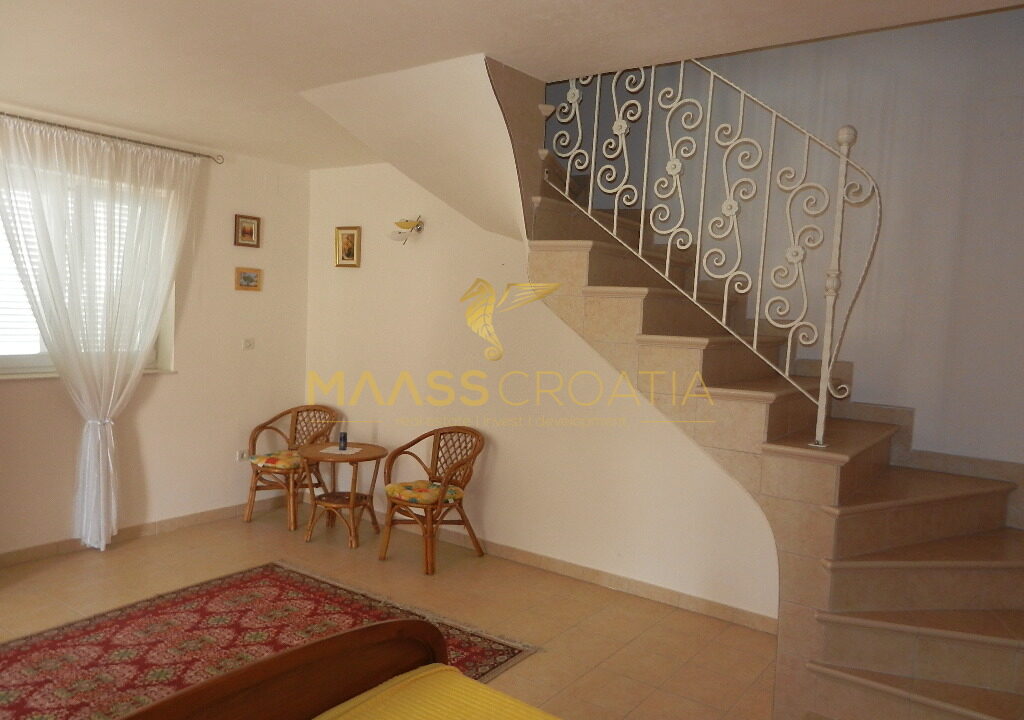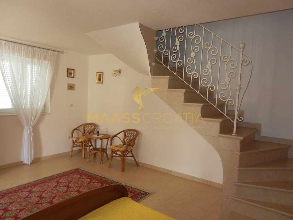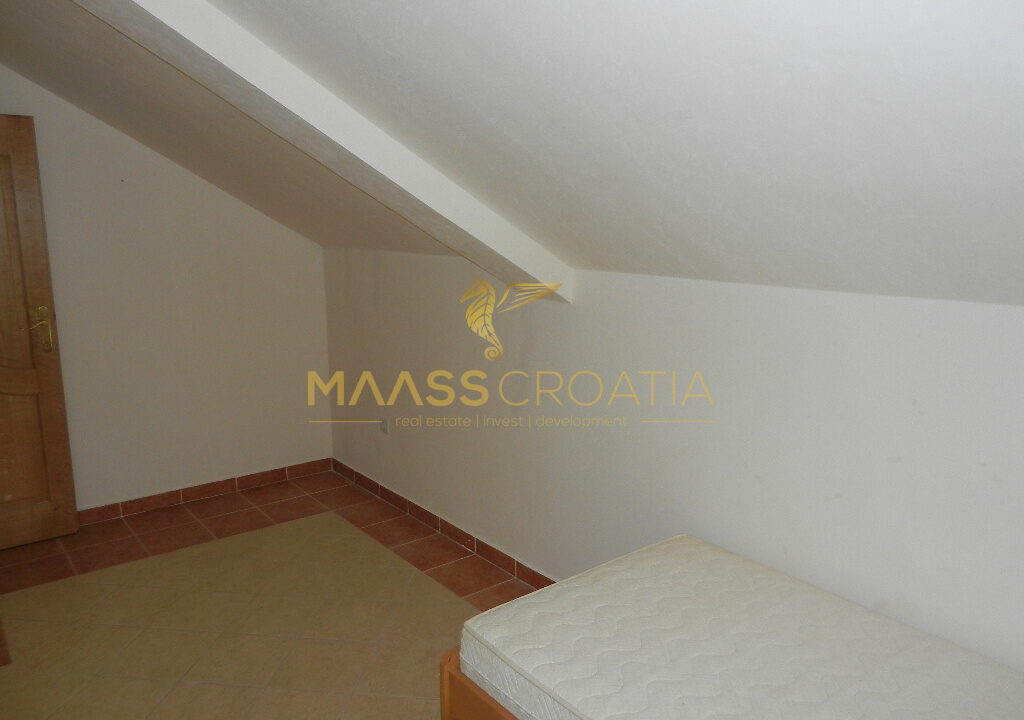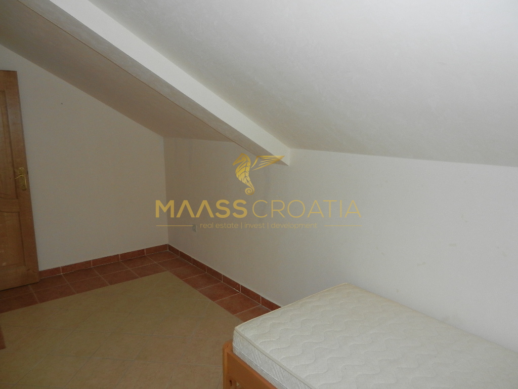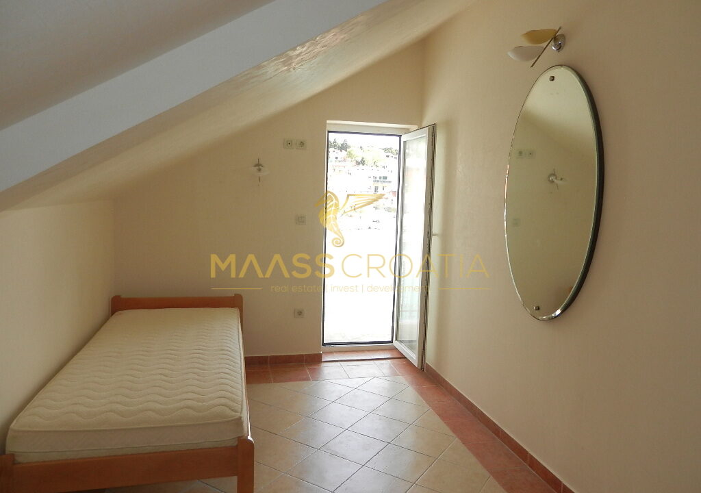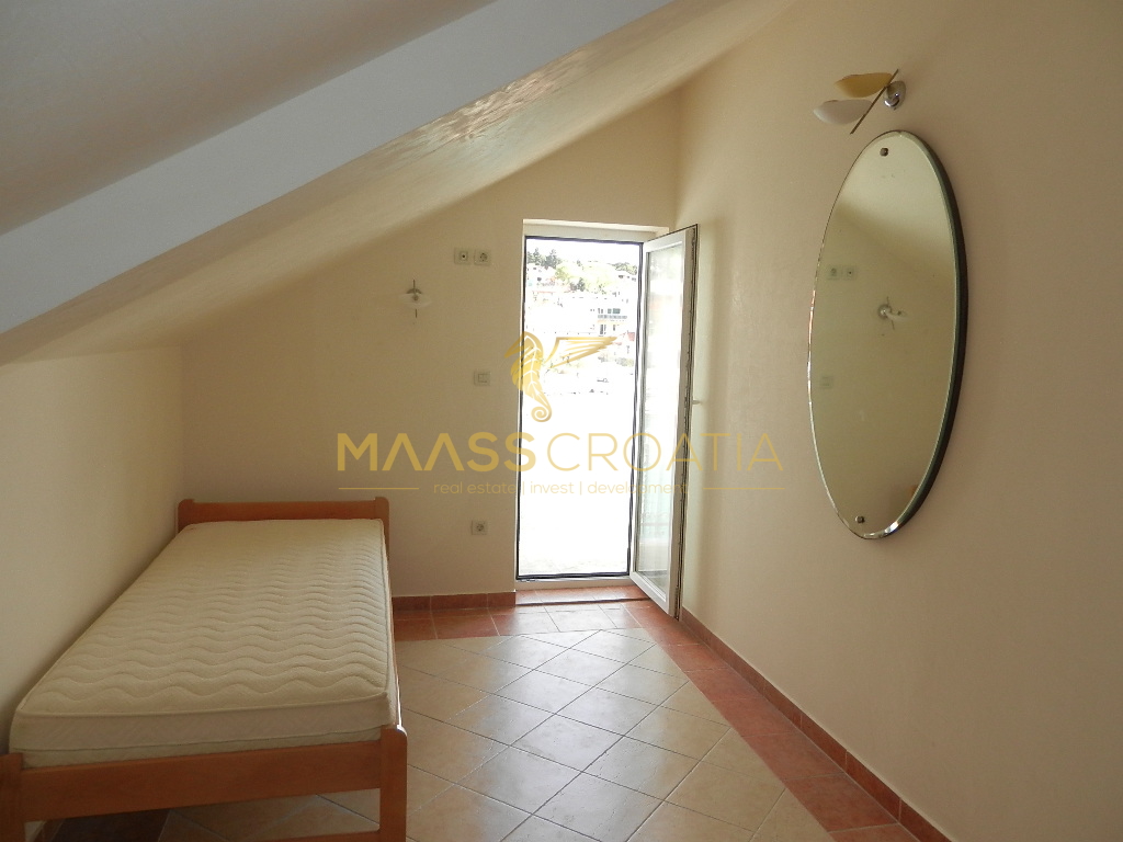 De bovenste verdieping en zolder is een duplex appartement van 66m2, met twee slaapkamers, keuken en woonkamer, twee badkamers, balkon 3m2, terras 10m2 met panoramisch uitzicht op zee.